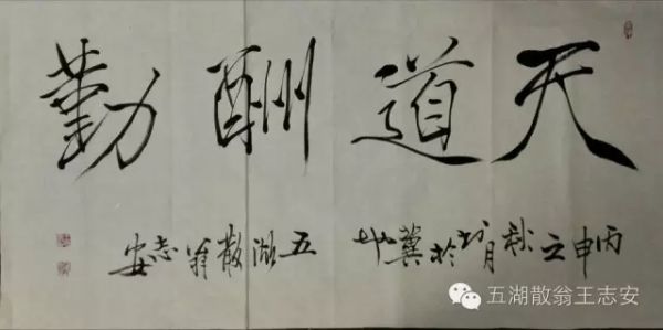 王志安先生的瘦金字书法作品笔法古雅,用笔干净利落,结体简约流便,法度森严。虽字字独立,却气韵流畅衔接自然。其字形略取纵势,重心安稳,中宫开阔。审美取向以中正为主,而不以奇崛,险怪取胜。聪慧的王志安还懂得思维定式具有积极与消极的两重性,懂得稳定性与寻找新鲜感的一致性。懂得从大处博观与从小处求精的辩证关系,他善于通过广泛学习总结经验,再返回到实践中锻炼出实际提高书法水平的能力。因此,王志安先生的瘦金字书法艺术的“雅”与“俗”的和谐并非是指在大众文化和商品经济浪潮下对艺术品消费审美趣味的一味迎合,而是在一个适当的起点上既满足了消费者的审美需要,又对审美趣味起到了一定的指引和提升作用。