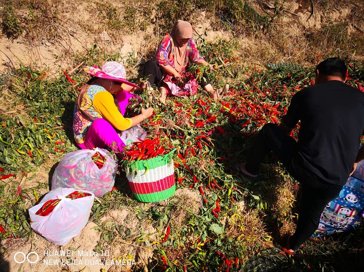 农民采摘绿辣子,显得人手很不足。绿辣摘不过来就变成了红辣子。成了红辣子只好放弃收摘。