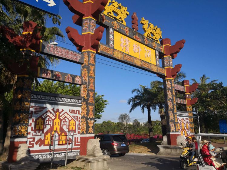 去槟榔河路上的牌坊上装饰着黎族人尊崇的纹饰